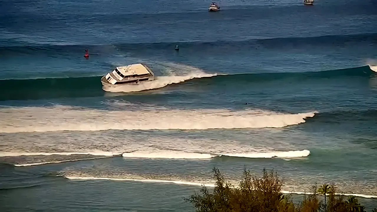 “The Discovery’s operator reported that two large waves disrupted his course and that he lost propulsion once the vessel went aground,” the Coast Guard said. “Sector Honolulu command center watchstanders received a report at 8:25 a.m. Saturday that the Discovery ran aground approximately 60 feet outside Kewalo Basin Harbor. The vessel’s captain and one crew member were aboard.”