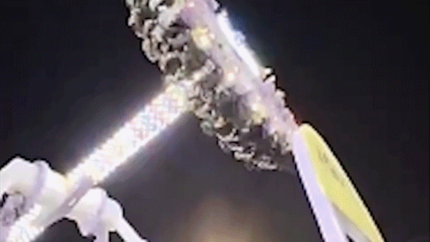Riders can be seen on the ground as the ride’s central pole recoils.  (East2West)