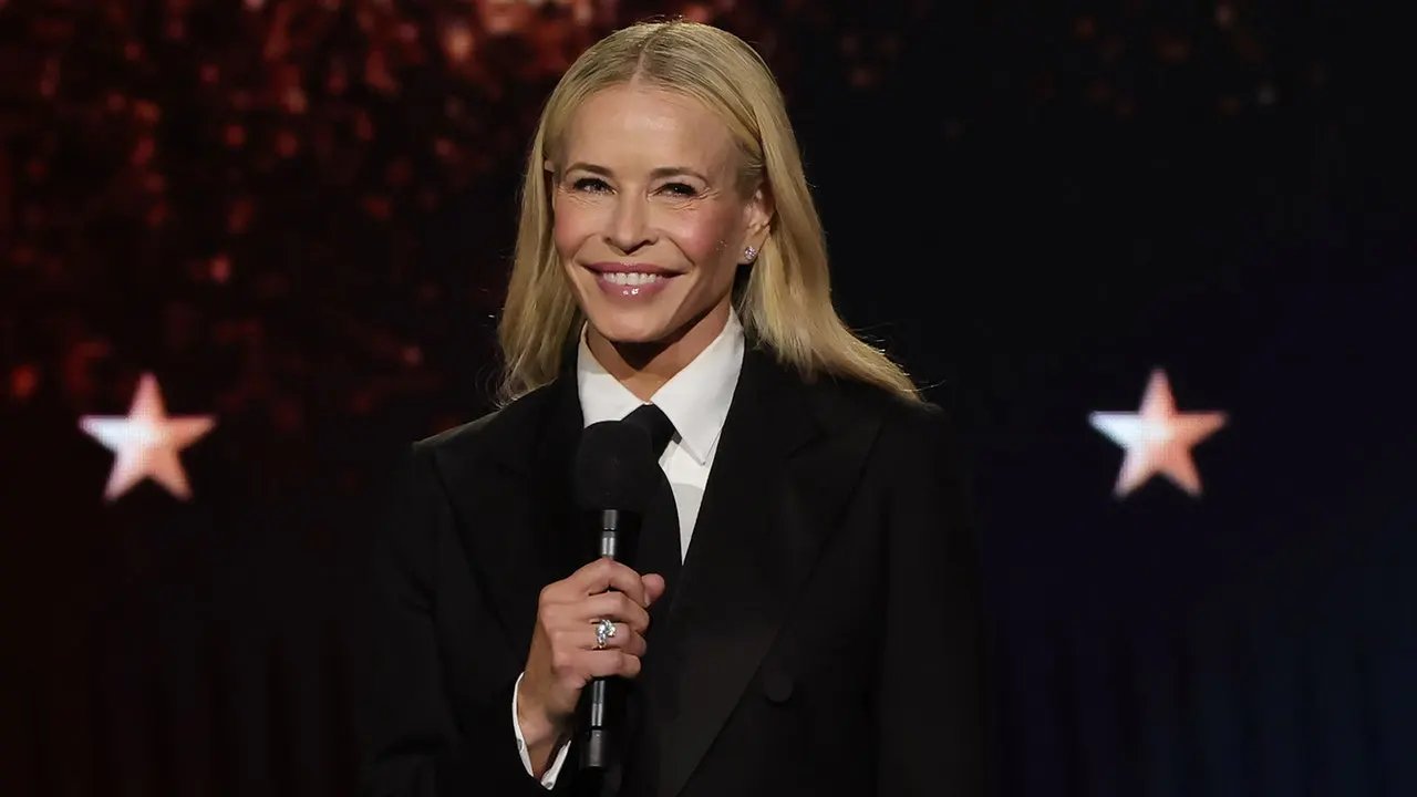 Chelsea Handler on stage in a suit hosting the Critic's Choice Awards in January 2026.