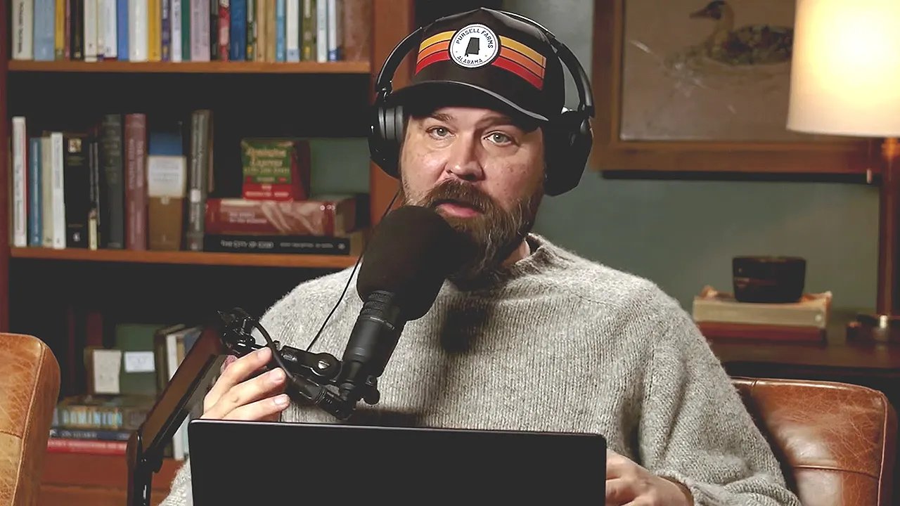 Zach Dasher from Duck Dynasty speaks into a microphone while recording the Unashamed podcast at a desk with a laptop in a book-lined studio.