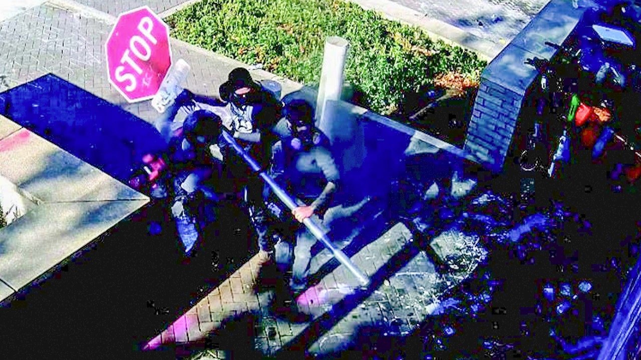 Robert Jacob Hoopes and others allegedly using a stop sign as a battering ram. (United States Attorney’s Office for the District of Oregon )