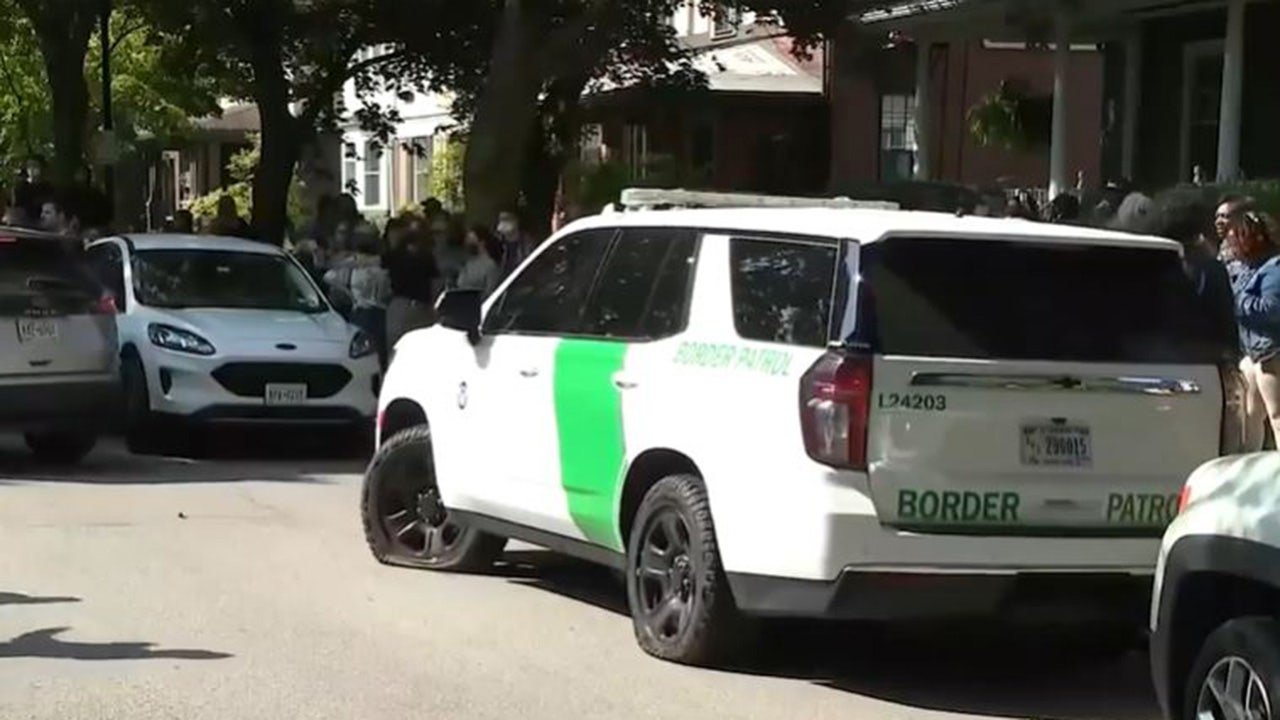 A Border Patrol vehicle is seen with flat tires after protesters showed up at a home where federal agents were conducting a removal operation Tuesday in Rochester, N.Y. (WHAM)