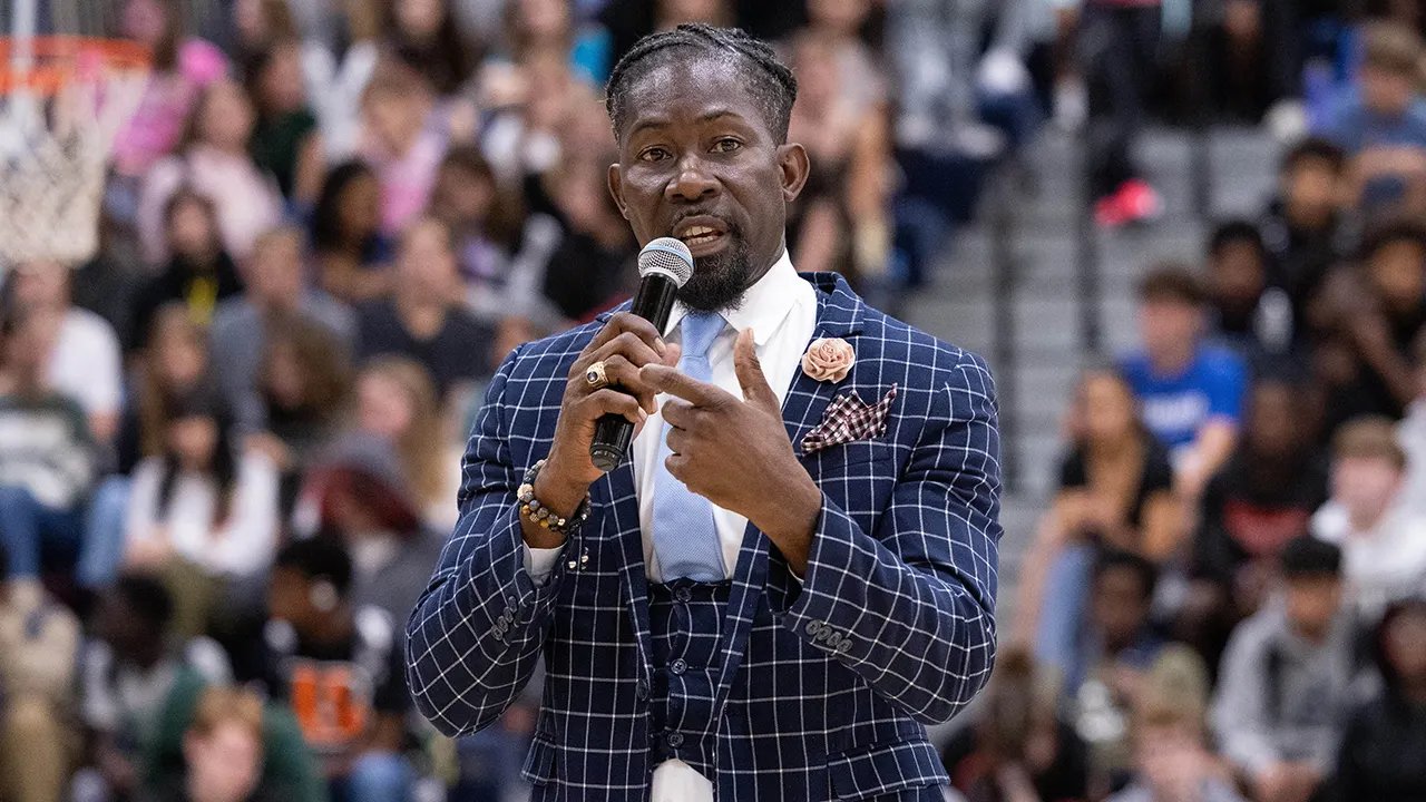 Ian Roberts, the former superintendent of Des Moines Public Schools, speaks to students at Theodore Roosevelt High School in Des Moines on Oct. 21, 2024. (Jon Lemons/Des Moines Public Schools via AP)