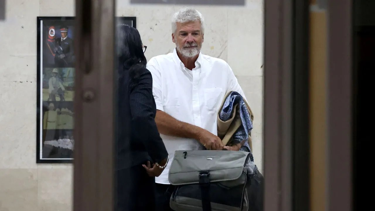 Brian Hooker leaves Central Police Station after being released from custody, Freeport, The Bahamas, Monday, April 13, 2026. Hooker, who is accompanied by his lawyer, Terrel A. Butler, was being questioned over the disappearance of his wife, Lynette Hooker, who he says fell overboard from their dinghy earlier this month. (Matthew Symons for Fox News Digital)