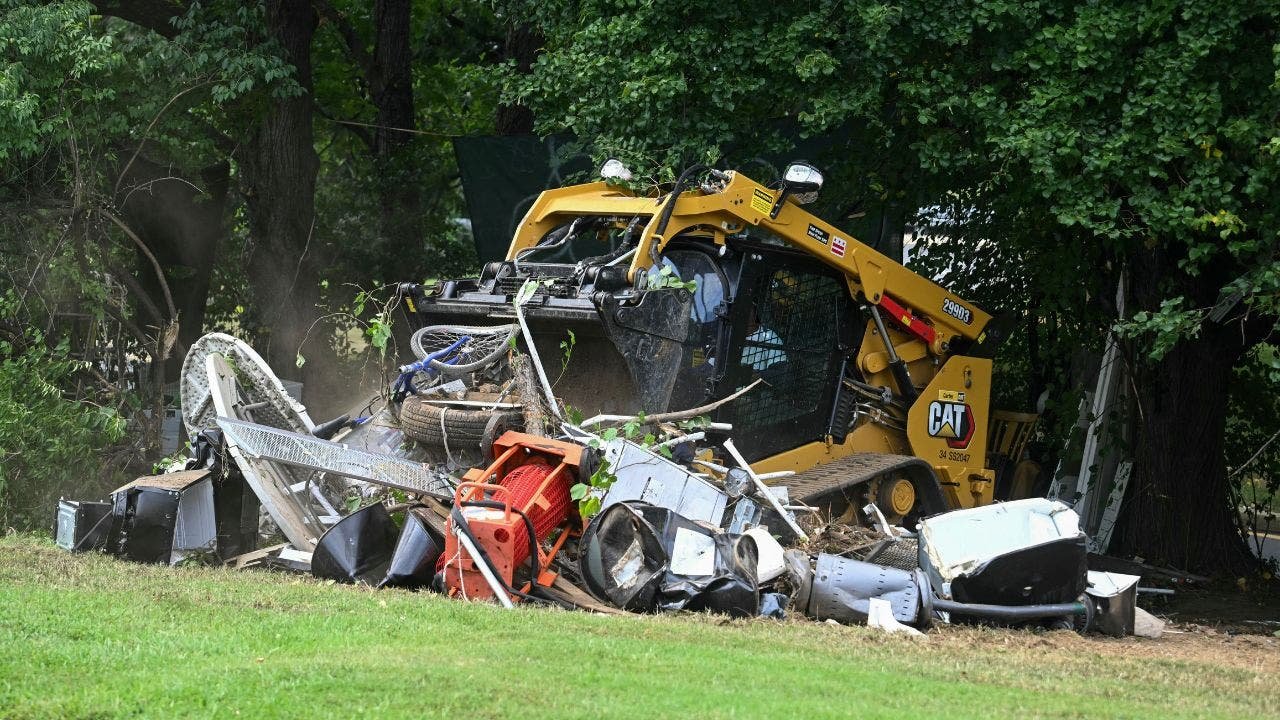 Washington, D.C., workers dismantle tents and remove personal belongings during a sweep of a homeless encampment in the Foggy Bottom neighborhood in Washington, D.C., Aug. 14, 2025. (Jim Watson/AFP via Getty Images)