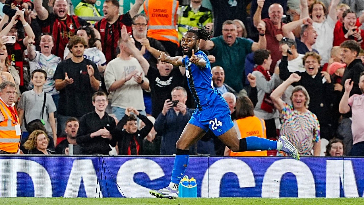 Bournemouth’s Antoine Semenyo celebrates scoring the second goal of an English Premier League soccer match against Liverpool at Anfield in Liverpool, England, Friday, Aug. 15, 2025.  (Peter Byrne/PA via AP)
