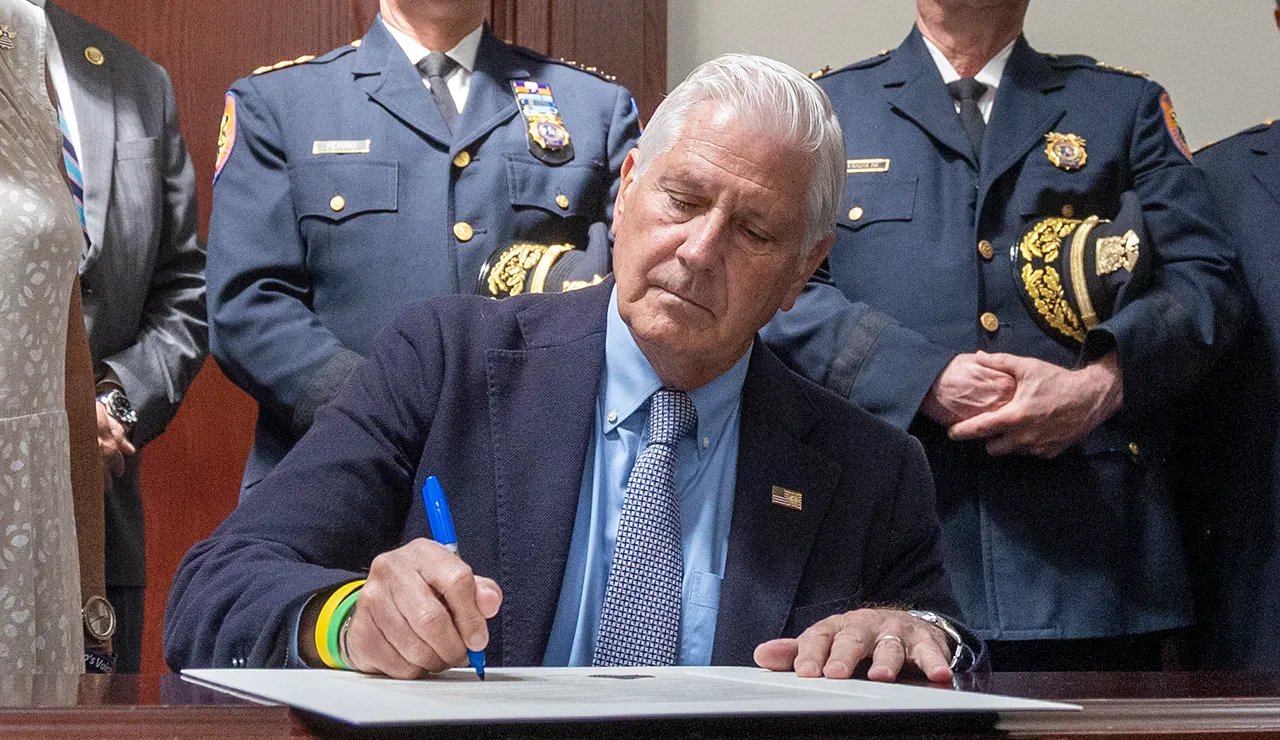 Nassau County Executive Bruce Blakeman signs an executive order showing the county’s support for federal, state, and local law enforcement officials by allowing masks for specific investigations in Nassau County on July 11, 2025, in Mineola, New York. (Howard Schnapp/Newsday RM via Getty Images)