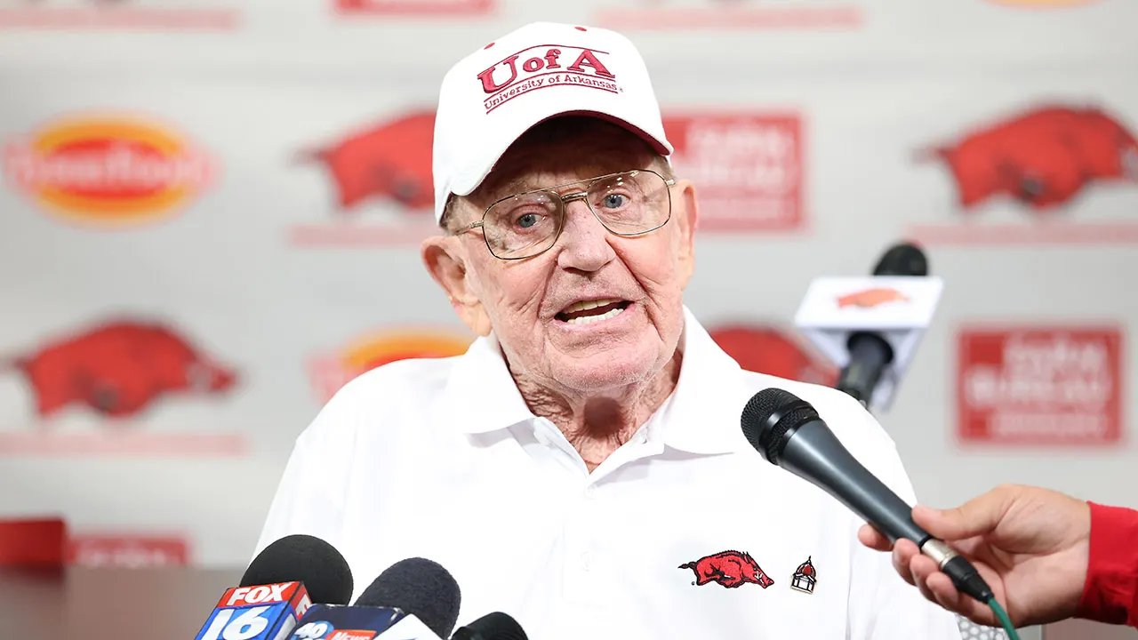 Former Notre Dame Fighting and Arkansas Razorbacks head coach Lou Holtz holds a press conference prior to the game at Donald W. Reynolds Razorback Stadium on Sept. 27, 2025. (Nelson Chenault/Imagn Images)