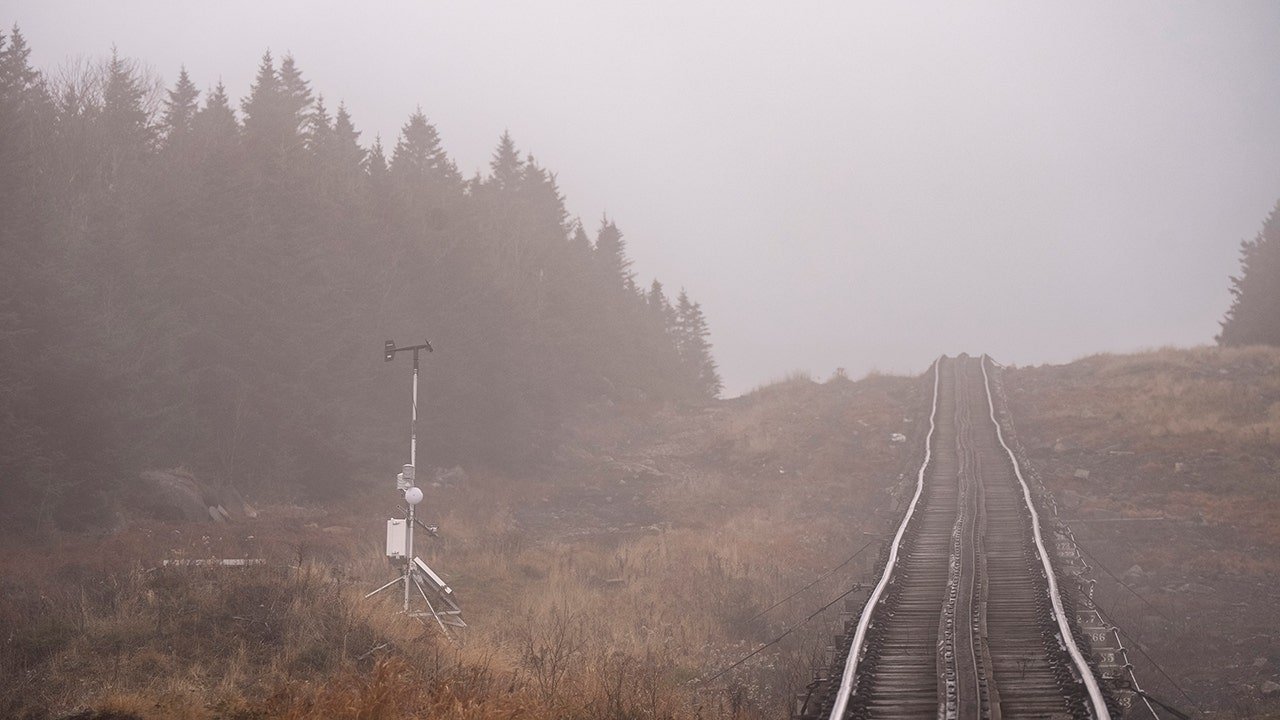 Fog blankets the upper section of the Mount Washington Cog Railway near the summit in Sargent’s Purchase, N.H. (Gregory Rec/Portland Press Herald via Getty Images)