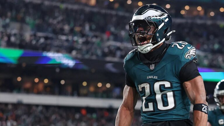 Philadelphia Eagles running back Saquon Barkley (26) celebrates after a touchdown against the Washington Commanders during the second half in the NFC Championship game at Lincoln Financial Field. (Bill Streicher/Imagn Images)