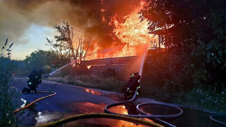 Firefighters put out the fire following a Russian attack in Kyiv region, Ukraine, on Wednesday, July 9, 2025.  (Ukrainian Emergency Service via AP)