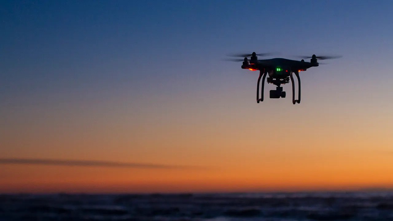 A drone flies over the ocean at dawn, capturing aerial views as the sun rises. (iStock)