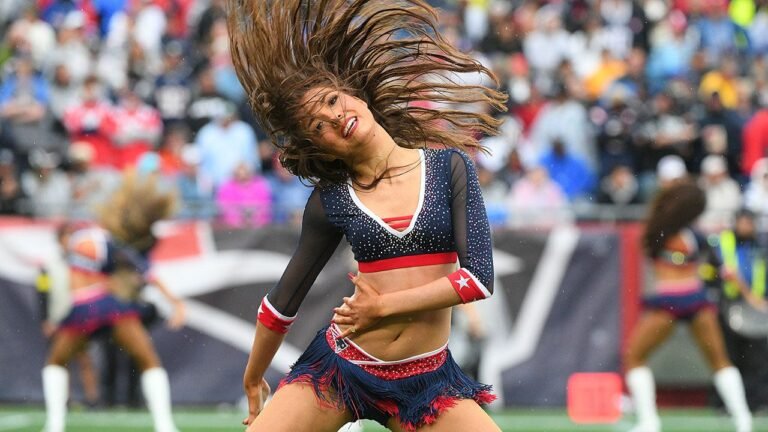 A gallery of photos shows the New England Patriots cheerleaders in action throughout the 2025 season as they cheer on the team and hope for a win.