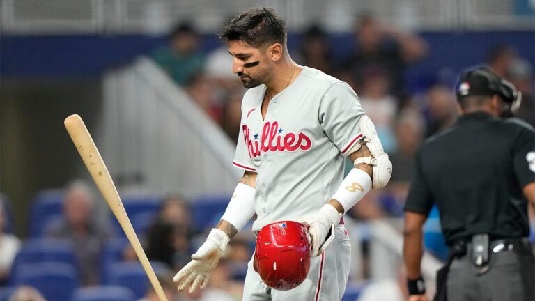 Philadelphia Phillies’ Nick Castellanos tosses his bat after he struck out swinging during the fourth inning of a baseball game against the Miami Marlins, Sunday, July 9, 2023, in Miami. (AP Photo/Lynne Sladky)