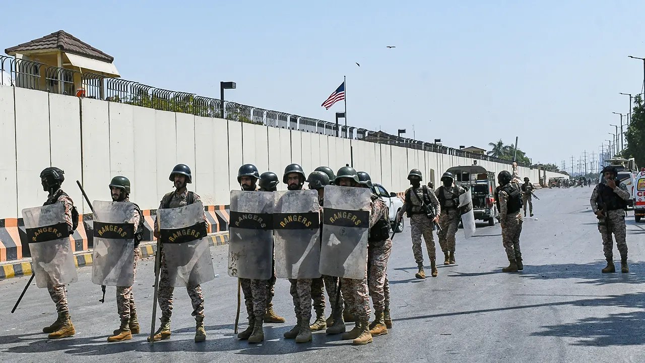Pakistani police and paramilitary forces responded as protesters attempted to breach the perimeter of the U.S. diplomatic mission in Karachi. (AP Photo/Ali Raza)