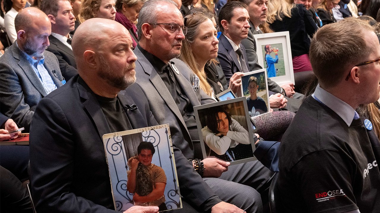 People hold pictures of victims during the U.S. Senate Judiciary Committee hearing “Big Tech and the Online Child Sexual Exploitation Crisis” in Washington, D.C., on Jan. 31, 2024. (Photo by ROBERTO SCHMIDT/AFP via Getty Images)