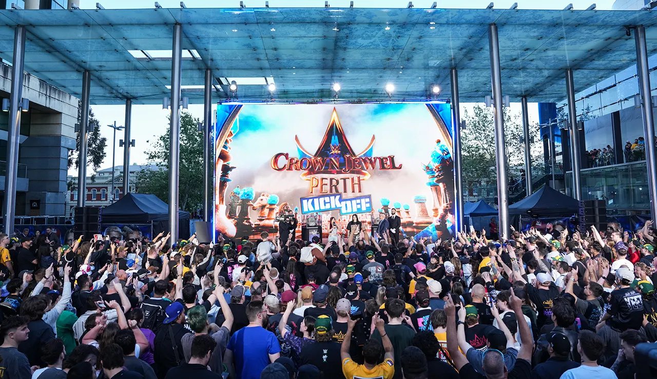 An arena scene while IYO SKY and Rhea Ripley are on stage during the 2025 Crown Jewel Kickoff at RAC Arena on Oct. 10, 2025 in Perth, Australia. (Craig Ambrosio/WWE via Getty Images)