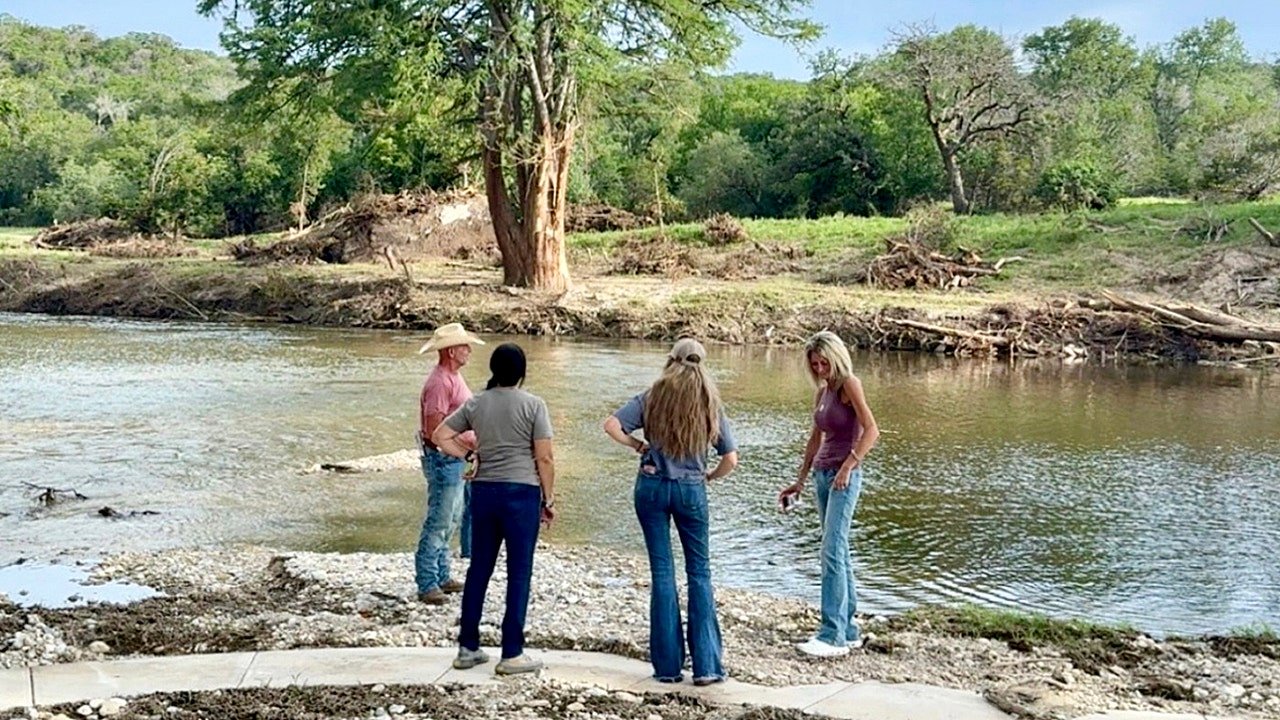 Janice Riley, Michelle Annette, and Lisa Aguillen join Bud Bolton in surveying damage in Kerrville, TX in July 2025. (Fox News Digital/Sophia Leone)