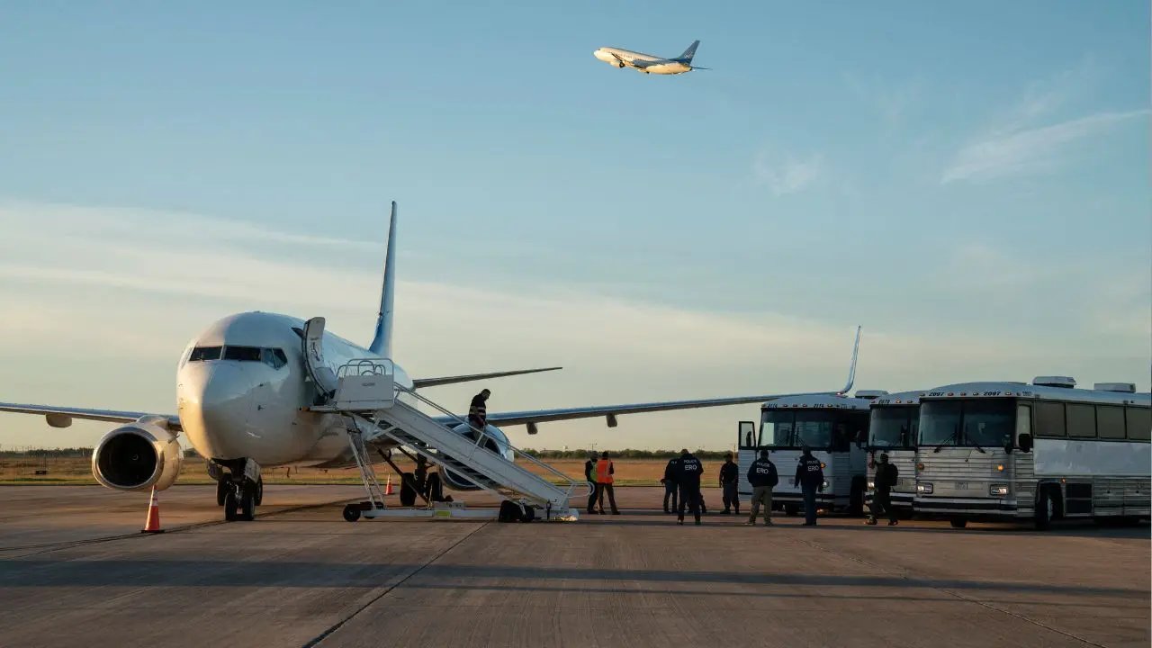 Buses transporting migrants to board a deportation flight of illegal Venezuelans after a US-Venezuelan agreement (VERONICA G. CARDENAS/AFP via Getty Images)