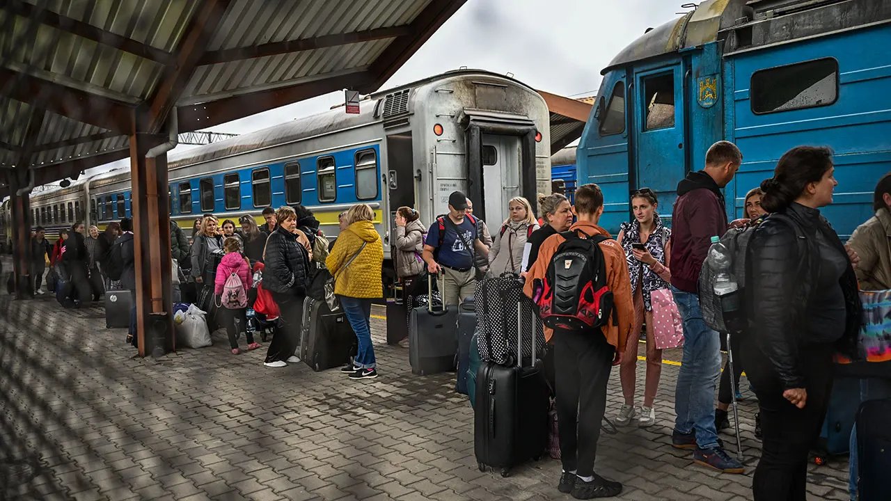 Ukrainians carry their bags as they get off a train from Zaporizhzhia at Przemysl train station on September 30, 2022 in Przemysl, Poland. (Omar Marques/Getty Images)